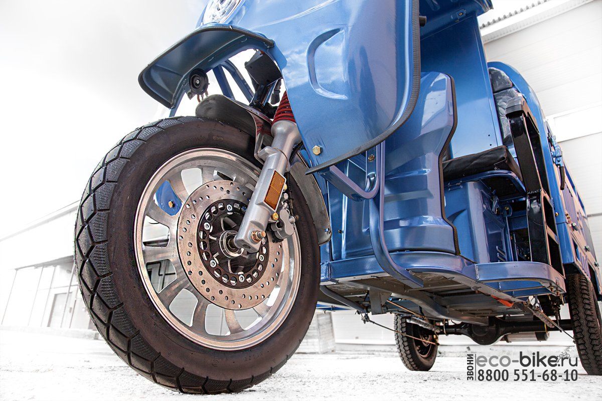 А ещё мы установили на Гермес PRO один из самых мощных моторов в серии: 2200 ватт - он способен питаться как от 60 Вольтового комплекта аккумуляторов, так и от напряжения в 72 Вольта (6 тяговых АКБ по 12 Вольт каждый). Ход и динамика трицикла необычайно плавные, а превосходная амортизация добавит комфорта в поездке. Также от младшей модели Rutrike Гермес трицикл отличает наличие переднего дискового гидравлического тормоза.